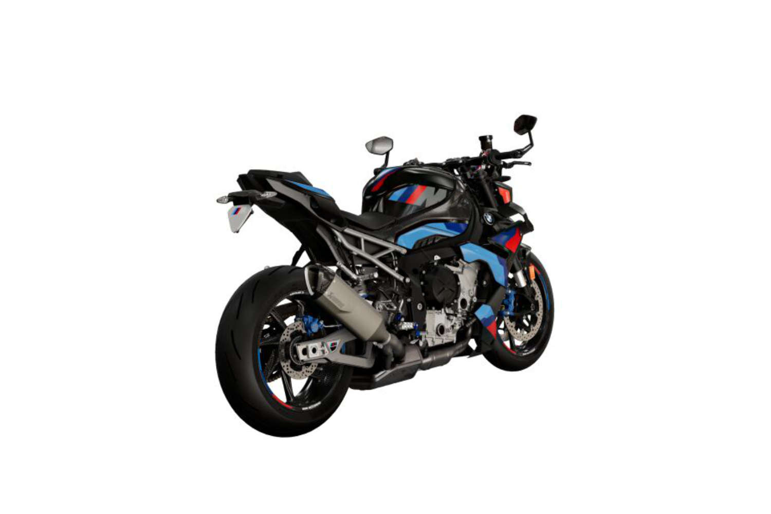 Paket koncovky výfuku M zdůrazňuje sportovní charakter motocyklu díky vysoce kvalitním součástem a exkluzivnímu označení M. Frézované díly z dvojitě eloxovaného hliníku, včetně sklopných a nastavitelných páček spojky a brzdy, krytu páčky brzdy M, systému stupaček jezdce M a chrániče motoru M, zvyšují hodnotu na maximum.