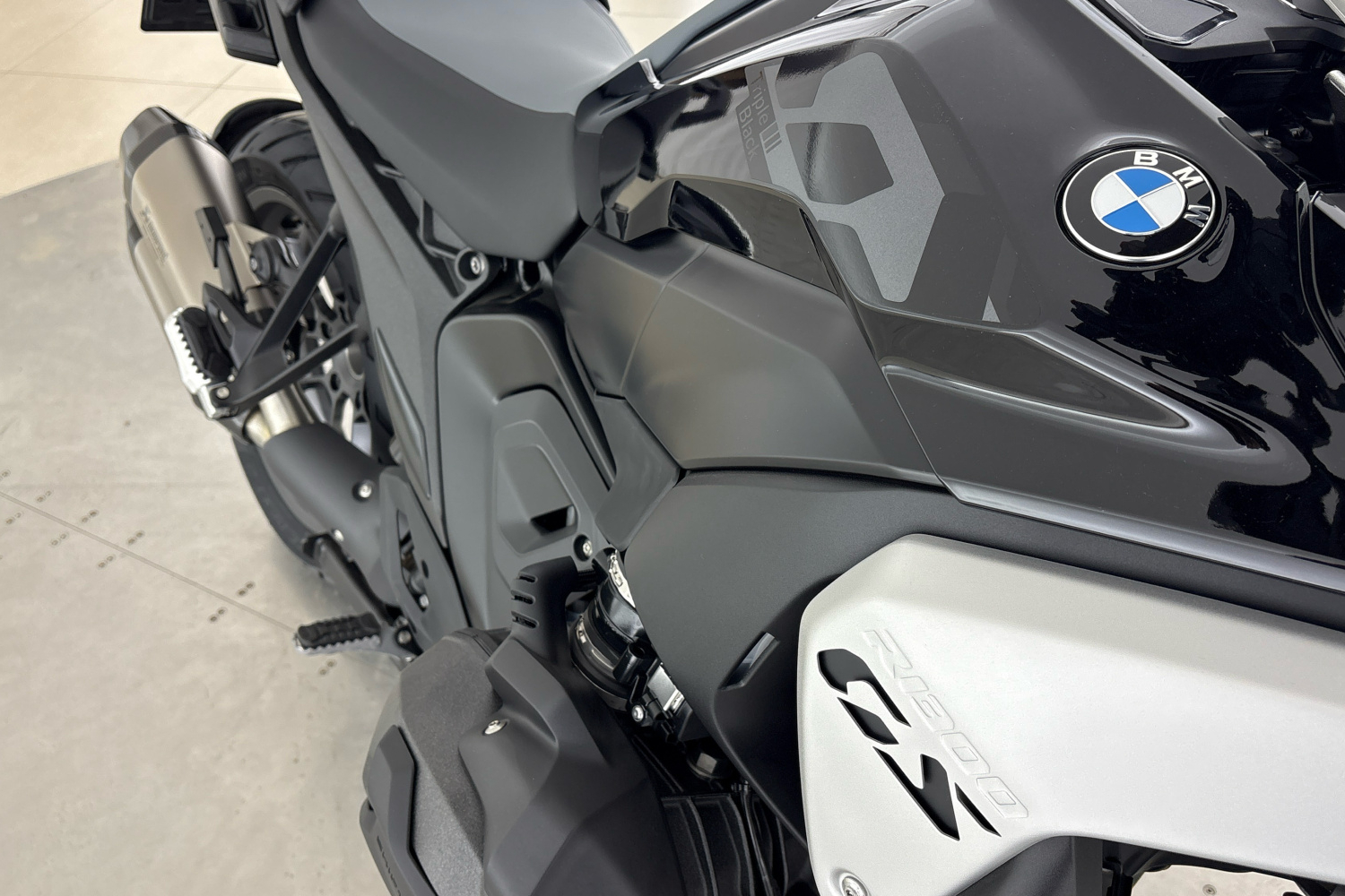 Ve stylu Triple Black má cestovní motocykl stylově elegantní vzhled v metalické barvě Black Storm a Black s základním rámem a víky hlav válců v barvě Agate grey a harmonickými detaily.