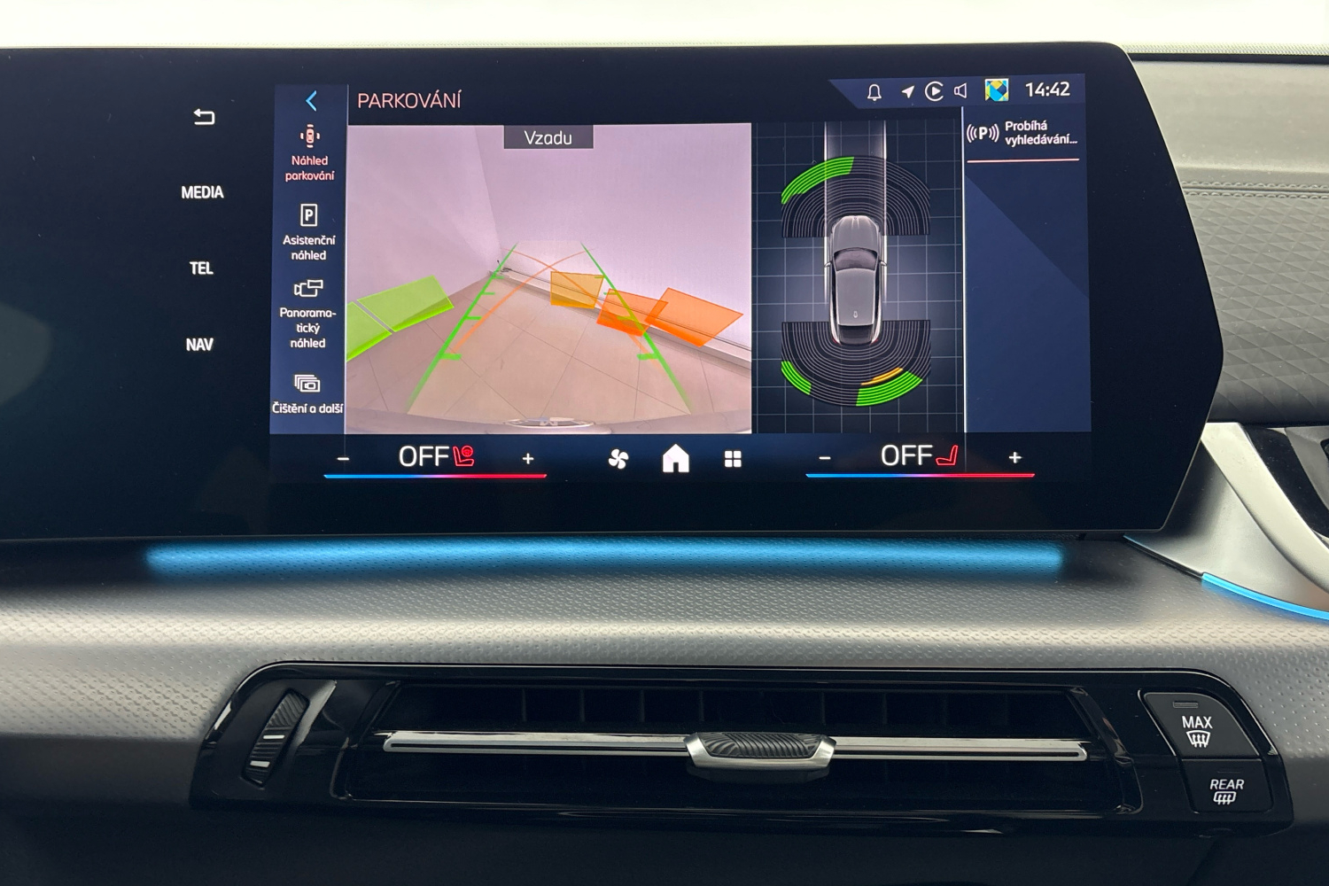 Při parkování lze využít boční senzory, které sledují oblasti po stranách vozu a zobrazují překážky na kontrolním displeji. Funkce nouzového brzdění Active Park Distance Control nabízí řidiči podporu v případech, kdy je nutné do parkovacího místa zacouvat, a přispívá tak k prevenci kolizí a zmenšení následků nárazů do překážek.