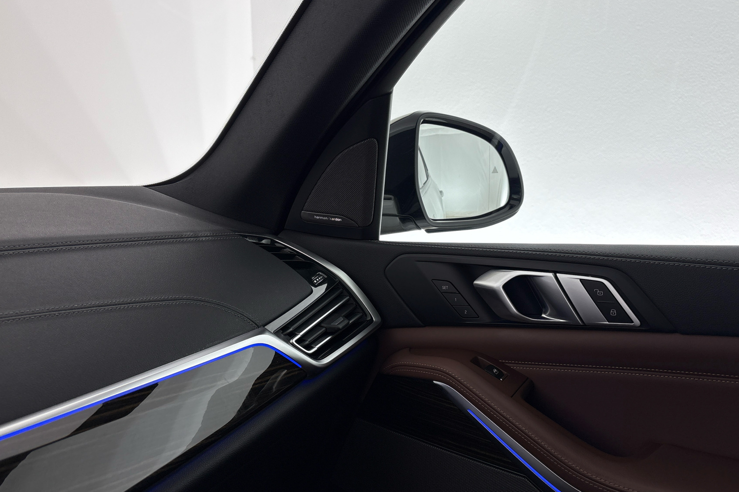 Reproduktory prvotřídní kvality se vyznačují šestihrannou perforovanou deskou v tmavém provedení Titan. Centrální výškový a středový reproduktor jsou umístěny uprostřed přístrojové desky. Dva výškové reproduktory v úchytech zpětných zrcátek a dva středové reproduktory v panelech předních dveří jsou označeny logem Harman Kardon, stejně jako středové reproduktory v obložení zadních dveří. Dva centrální subwoofery pod předními sedadly zaujmou svým objemem a dva výškové reproduktory a středové reproduktory v čalounění stropu zajišťují vynikající poslech i cestujícím na zadních sedadlech. Zvuk se upravuje pomocí časem prověřeného ergonomického ovladače iDrive a kontrolního displeje.