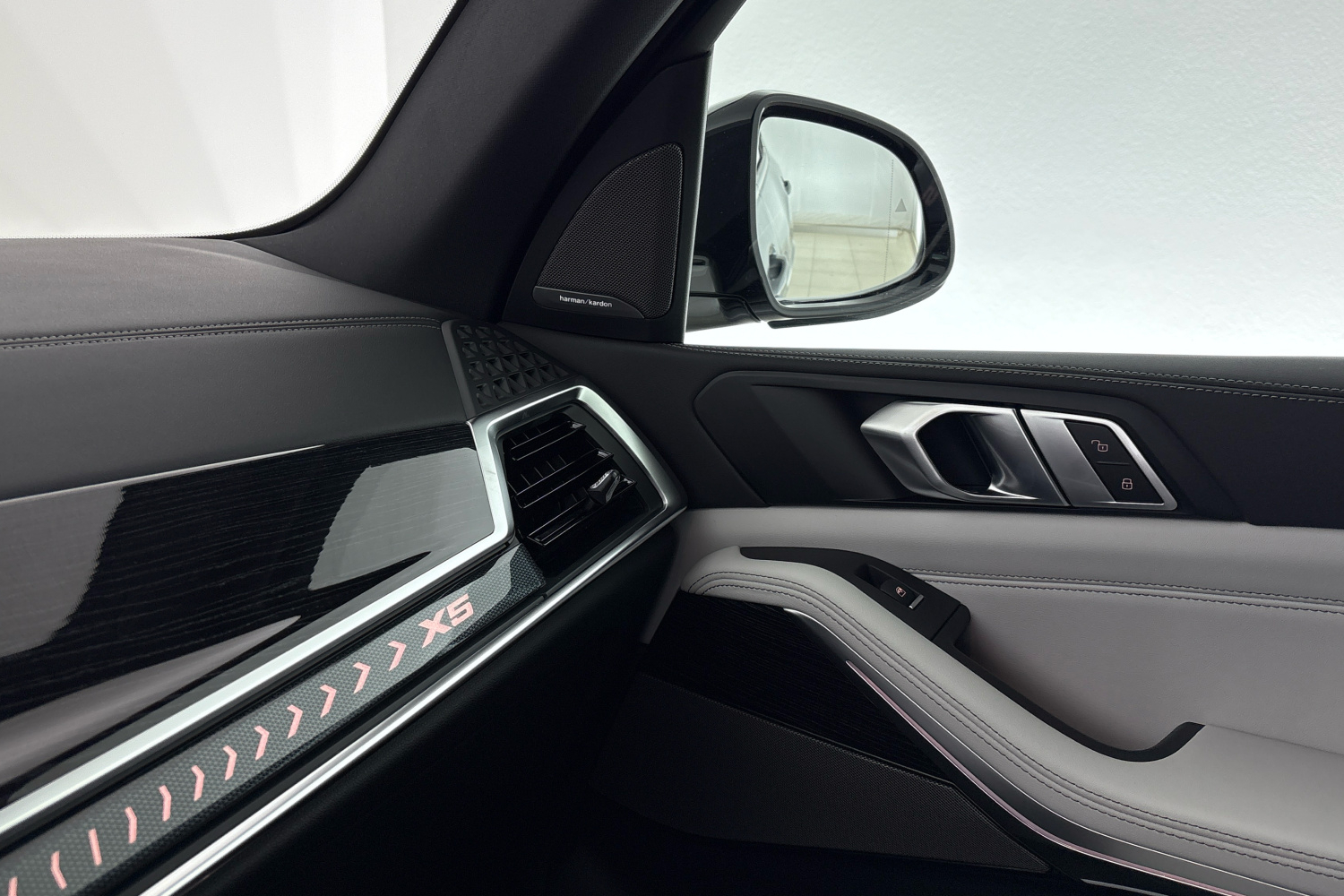 Reproduktory prvotřídní kvality se vyznačují šestihrannou perforovanou deskou v tmavém provedení Titan. Centrální výškový a středový reproduktor jsou umístěny uprostřed přístrojové desky. Dva výškové reproduktory v úchytech zpětných zrcátek a dva středové reproduktory v panelech předních dveří jsou označeny logem Harman Kardon, stejně jako středové reproduktory v obložení zadních dveří. Dva centrální subwoofery pod předními sedadly zaujmou svým objemem a dva výškové reproduktory a středové reproduktory v čalounění stropu zajišťují vynikající poslech i cestujícím na zadních sedadlech. Zvuk se upravuje pomocí časem prověřeného ergonomického ovladače iDrive a kontrolního displeje.