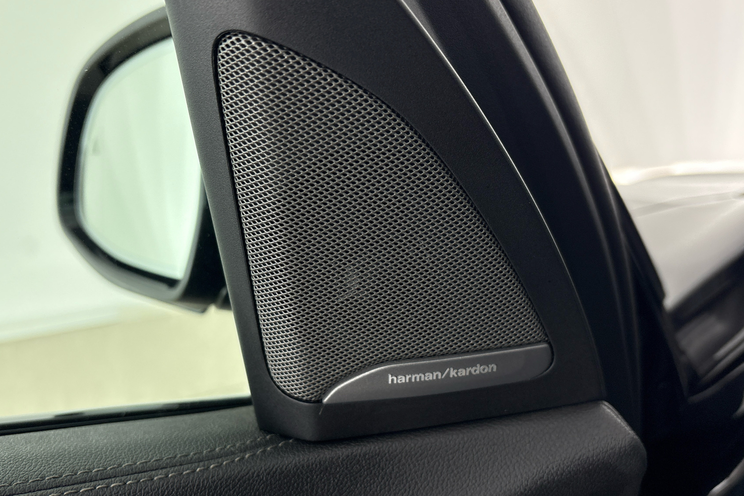 Reproduktory prvotřídní kvality se vyznačují šestihrannou perforovanou deskou v tmavém provedení Titan. Centrální výškový a středový reproduktor jsou umístěny uprostřed přístrojové desky. Dva výškové reproduktory v úchytech zpětných zrcátek a dva středové reproduktory v panelech předních dveří jsou označeny logem Harman Kardon, stejně jako středové reproduktory v obložení zadních dveří. Dva centrální subwoofery pod předními sedadly zaujmou svým objemem a dva výškové reproduktory a středové reproduktory v čalounění stropu zajišťují vynikající poslech i cestujícím na zadních sedadlech. Zvuk se upravuje pomocí časem prověřeného ergonomického ovladače iDrive a kontrolního displeje.