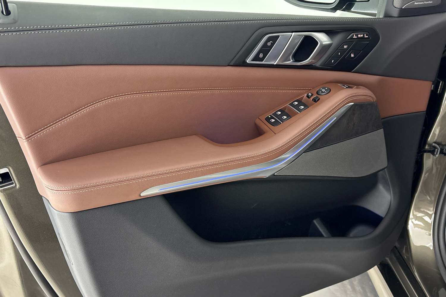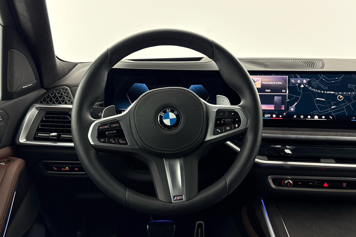 Reproduktory prvotřídní kvality se vyznačují šestihrannou perforovanou deskou v tmavém provedení Titan. Centrální výškový a středový reproduktor jsou umístěny uprostřed přístrojové desky. Dva výškové reproduktory v úchytech zpětných zrcátek a dva středové reproduktory v panelech předních dveří jsou označeny logem Harman Kardon, stejně jako středové reproduktory v obložení zadních dveří. Dva centrální subwoofery pod předními sedadly zaujmou svým objemem a dva výškové reproduktory a středové reproduktory v čalounění stropu zajišťují vynikající poslech i cestujícím na zadních sedadlech. Zvuk se upravuje pomocí časem prověřeného ergonomického ovladače iDrive a kontrolního displeje.
