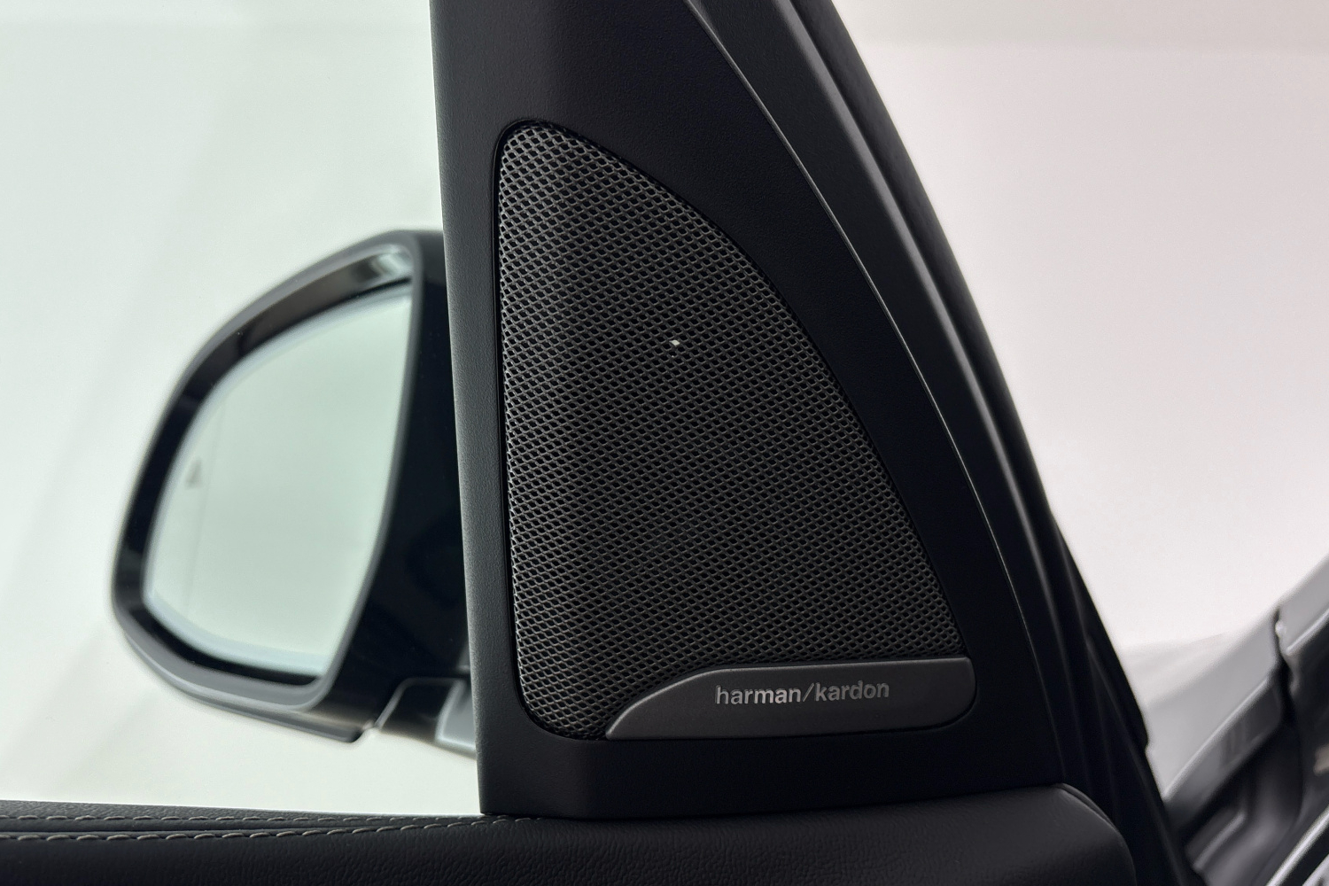 Reproduktory prvotřídní kvality se vyznačují šestihrannou perforovanou deskou v tmavém provedení Titan. Centrální výškový a středový reproduktor jsou umístěny uprostřed přístrojové desky. Dva výškové reproduktory v úchytech zpětných zrcátek a dva středové reproduktory v panelech předních dveří jsou označeny logem Harman Kardon, stejně jako středové reproduktory v obložení zadních dveří. Dva centrální subwoofery pod předními sedadly zaujmou svým objemem a dva výškové reproduktory a středové reproduktory v čalounění stropu zajišťují vynikající poslech i cestujícím na zadních sedadlech. Zvuk se upravuje pomocí časem prověřeného ergonomického ovladače iDrive a kontrolního displeje.
