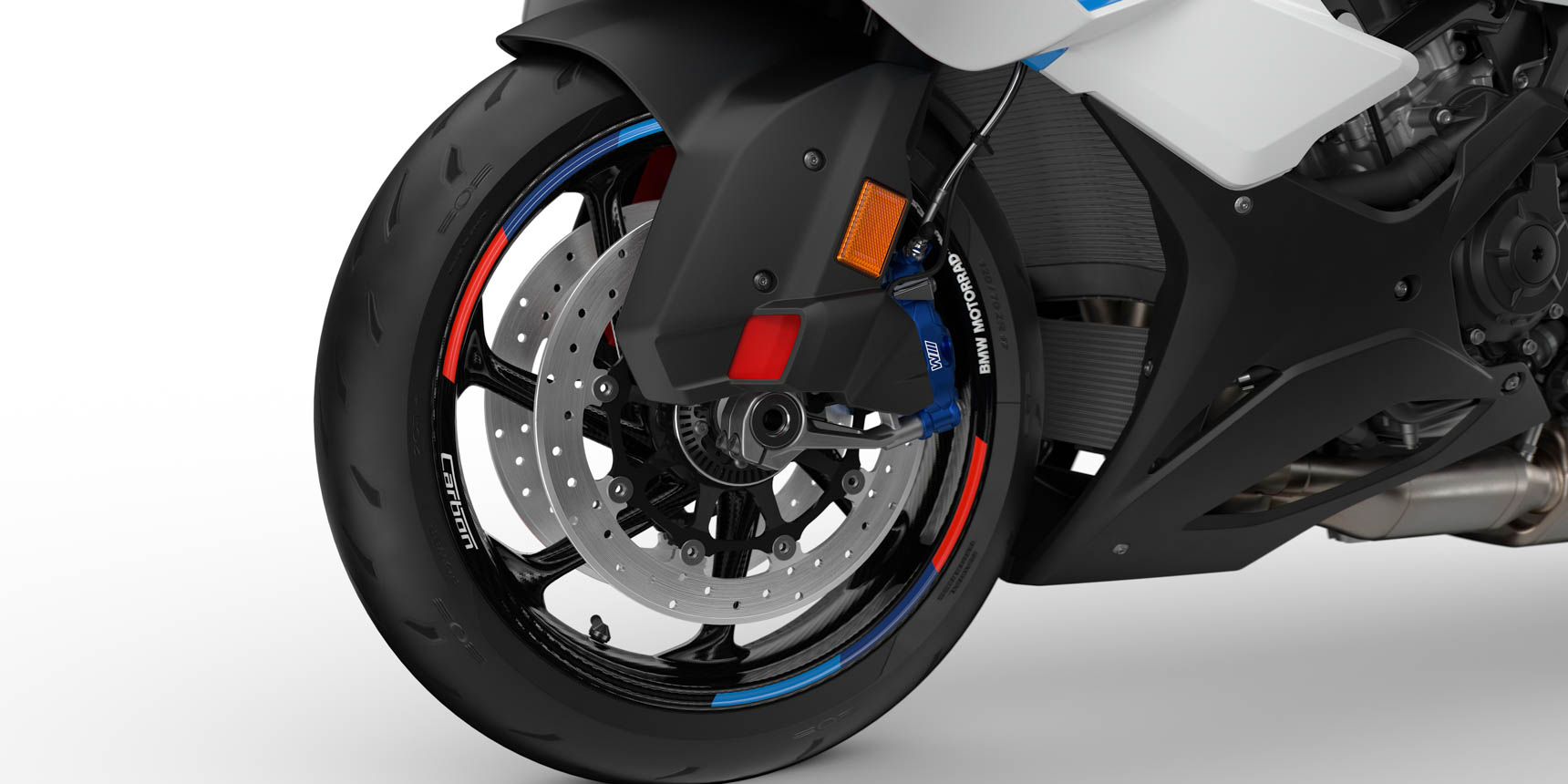 Dokonalé čtení povrchu závodní trati má vpředu na starosti masivní obrácená teleskopická vidlice o průměru 45 milimetrů, jež umožňuje jezdcům plné nastavení předpětí, zpětného útlumu i komprese, zatímco zadní kolo nekompromisně tlačí k zemi hliníková spodní kyvná vidlice Full-Floater Pro. Špičkový mechanický grip s vozovkou pak obstarávají prémiové pneumatiky o rozměrech 120/70 ZR17 vpředu a širokých 190/55 ZR17 vzadu. Jakmile ale přijde čas na tvrdé brzdění před apexem, nastupuje na scénu nekompromisní brzdná síla masivních čtyřpístkových pevných třmenů, které se vpředu ostře zakousnou do dvou kotoučů o průměru 320 milimetrů a tloušťce 4,5 milimetru. Těm sebevědomě sekunduje zadní jednokotoučová brzda o průměru 220 milimetrů osazená jednopístkovým plovoucím třmenem. Celý tento fascinující brzdový arzenál je navíc neustále pod bdělým dohledem pokročilého částečně integrálního systému BMW Motorrad Race ABS, jenž je obohacen o inovativní funkci Brake-Slide-Assist.